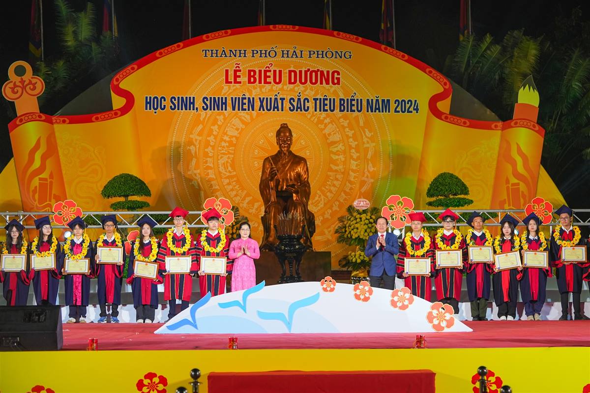 Năm 2024, thành phố biểu dương, tôn vinh 139 học sinh, sinh viên xuất sắc tiêu biểu, trong đó có: 03 Học sinh đoạt giải quốc tế, 01 học sinh đoạt giải cấp khu vực, 81 học sinh đoạt giải Nhất, giải Nhì, giải Ba trong các kỳ thi học sinh giỏi các môn văn hoá, Cuộc thi Khoa học kỹ thuật cấp quốc gia năm học 2023-2024; Viết thư quốc tế UPU năm 2024. 31 Sinh viên tốt nghiệp thủ khoa loại giỏi trở lên các trường Đại học trên địa bàn thành phố và sinh viên là người Hải Phòng tốt nghiệp thủ khoa loại giỏi trở lên các Đại học, trường Đại học, Học viện trên toàn quốc. 23 Học sinh Hải Phòng tham dự lần đầu Kỳ thi tốt nghiệp Trung học phổ thông năm 2024 đạt điểm cao và đỗ vào Đại học, trường Đại học, Học viện trong hoặc ngoài nước.