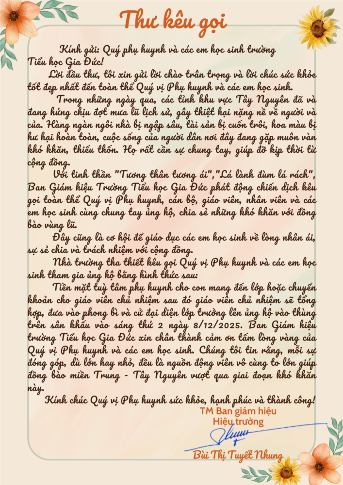 Thực hiện thư ngỏ kêu gọi ủng hộ đồng bào các tỉnh miền Trung - Tây Nguyên khắc phục hậu quả mưa lũ của Uỷ ban MTTQ Việt Nam thành phố Hải Phòng; Chi uỷ, BGH trường Tiểu học Gia Đức nhất trí kêu gọi ủng hộ của cán bộ, giáo viên, nhân viên và học sinh trong toàn trường với các nội dung sau:
