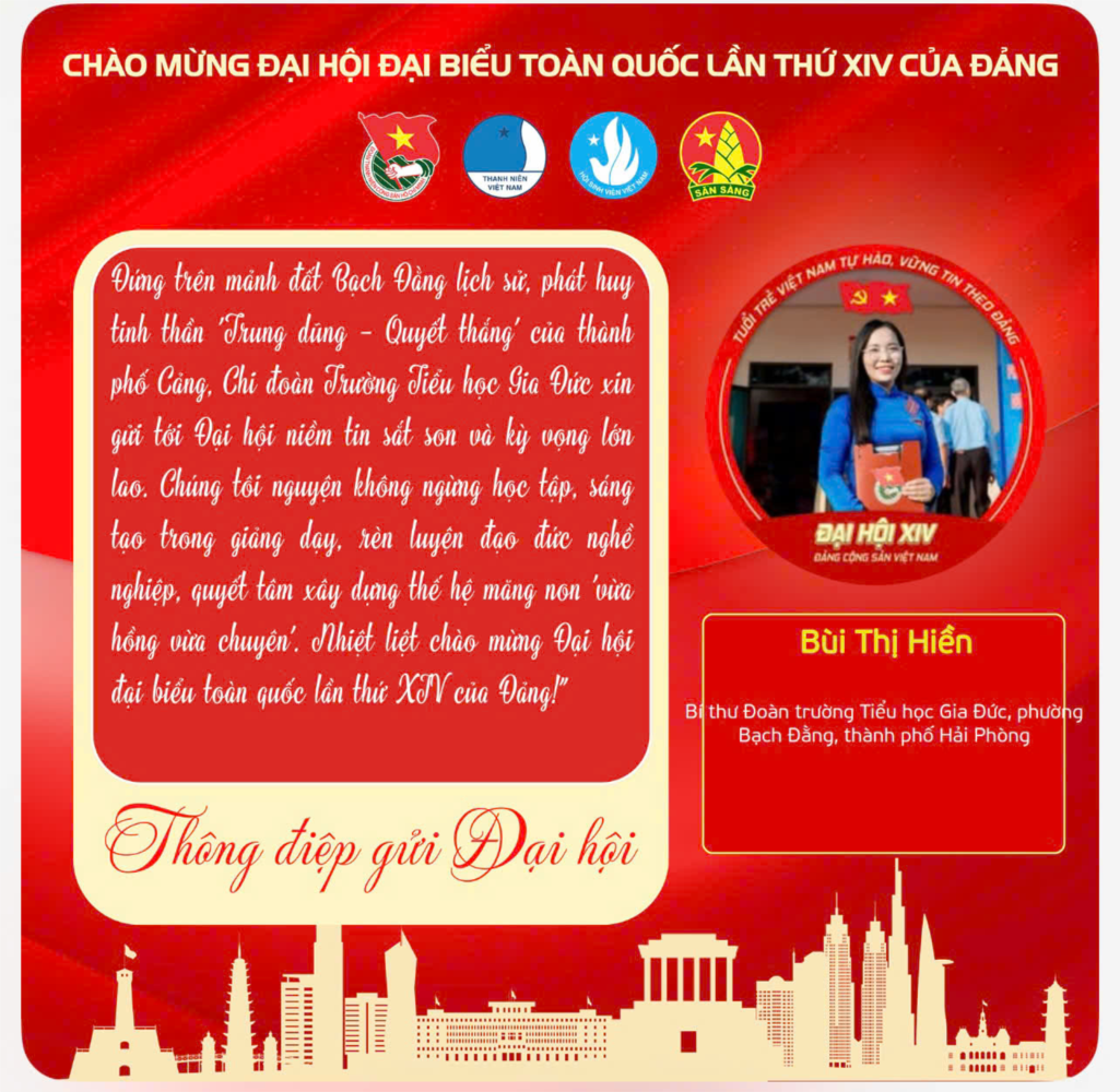 Đứng trên mảnh đất Bạch Đằng lịch sử, phát huy tinh thần 'Trung dũng - Quyết thắng' của thành phố Cảng, Chi đoàn Trường Tiểu học Gia Đức xin gửi tới Đại hội niềm tin sắt son và kỳ vọng lớn lao. Chúng tôi nguyện không ngừng học tập, sáng tạo trong